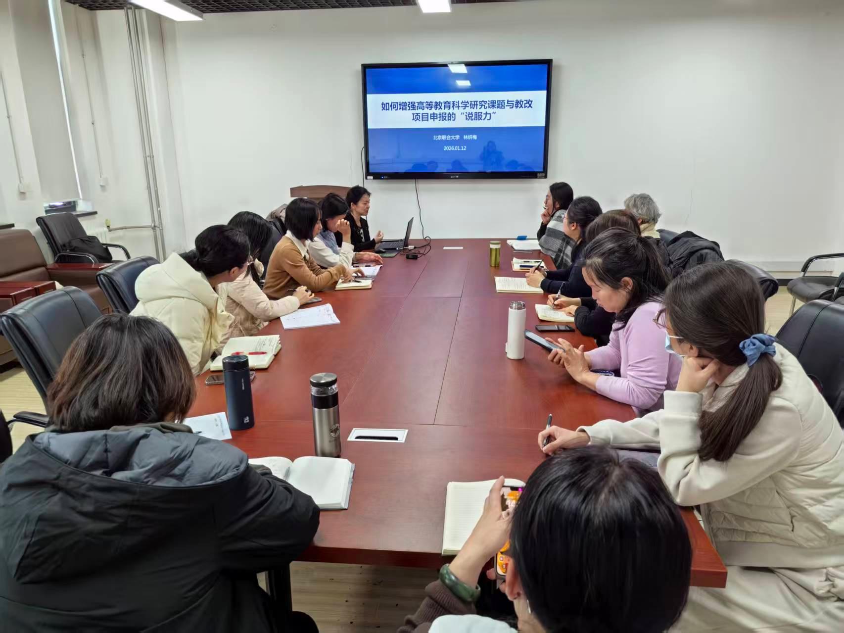 2026年1月12日,植科学院举办了第四期青年教师成长沙龙。本次活动邀请了北京联合大学教育质量监控与评估办公室副主任、全国普通高等学校本科教育教学评估专家、北京高校课程思政建设专家咨询委员会委员林妍梅研究员担任主讲嘉宾,以“如何增强高等教育科学研究课题与教改项目申报的‘说服力’”核心议题,为青年教师破解申报困境、提升项目质量搭建交流学习平台,助力教师专业成长与学院教育教学改革深度推进。